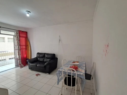 Apartamento mobiliado com 1 dormitório, sala com sacada, cozinha, banheiro social e 1 vaga de garagem coletiva. Localizado no 1º andar (acesso por escadas), a apenas 200 metros do mar, com documentação em ordem.