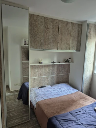 Apartamento com 50 m², 2 dormitórios com armários planejados, com portas de correr do teto ao piso, sala para 2 ambientes, com rack e painel planejado, sacada com vidros de correr e cortina rollon, banheiro com box blindex, gabinete, cuba moderna, chuveiro e torneira Deka , cozinha com armários planejados, lavanderia com armário planejado e varal de teto, todas as janelas com telas de proteção, piso frio imitando ripas de madeira envelhecidas e garagem para um automóvel.