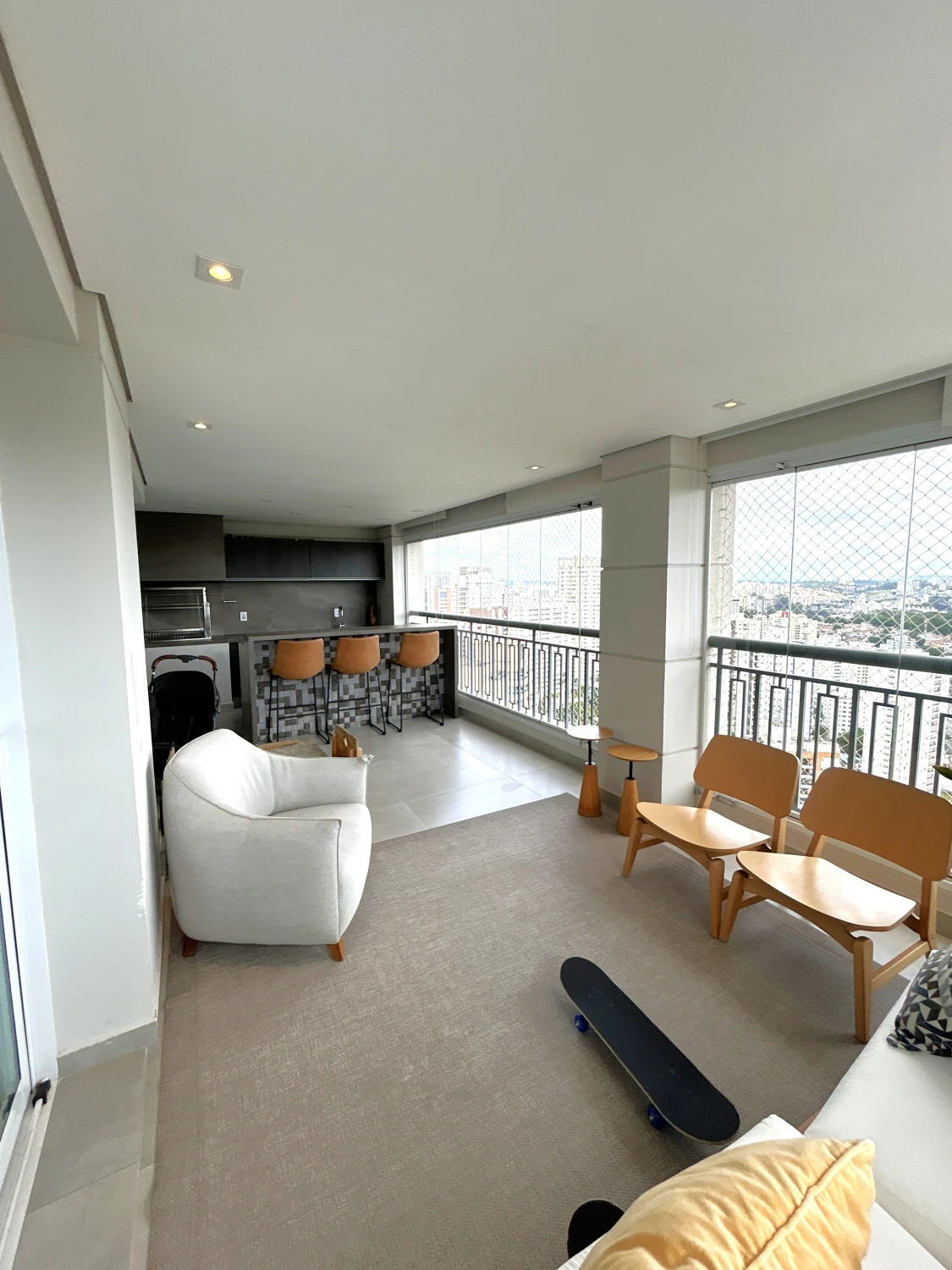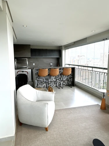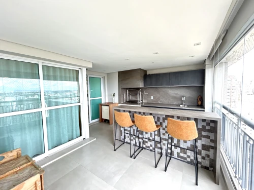 A varanda gourmet é ideal para momentos de lazer, com churrasqueira e uma vista livre. Se destaca também, armários no quarto, armários nos banheiros, armários na cozinha, ar condicionado, chuveiro a gás, closet, cozinha americana e área de serviço.