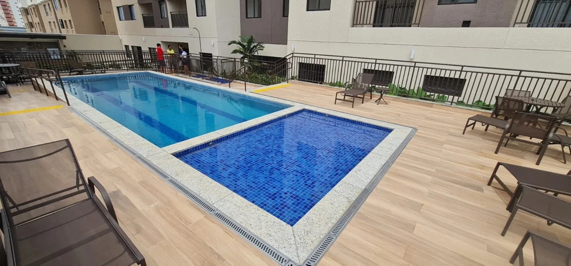 - Piscina com raia, deck seco e molhado.