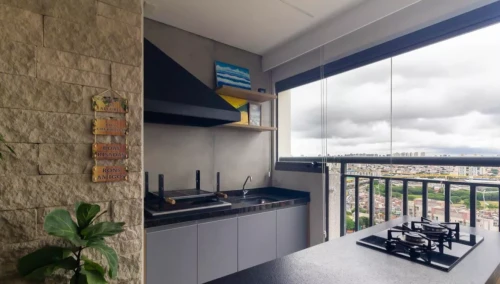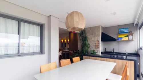 Área útil: 92 m², 2 dormitórios, ambos suítes, 1 sala ampla, Varanda gourmet, 2 vagas de garagem, Aquecedor de passagem, Ar-condicionado, Área de serviço, Armários embutidos Banheiro privativo e social, Churrasqueira, Cozinha moderna, Elevador, Gás encanado.