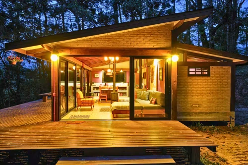 O grande diferencial são as portas de correr em vidro que se abrem integralmente. Quando abertas, o living e o deck de madeira fundem-se ao bosque de 5.500 m², eliminando as fronteiras entre o conforto interno e a energia vibrante das Araucárias e Manacás. É a sensação de flutuar sobre a floresta.