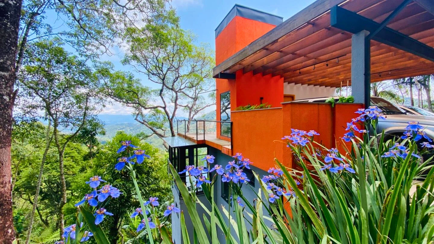 O grande diferencial desta propriedade é a sua conexão com o horizonte. Graças ao posicionamento estratégico dos amplos painéis de vidro, a casa oferece uma vista permanente e absolutamente exclusiva do pôr do sol — um ângulo único dentro do condomínio, onde o céu se funde à mata nativa em tons de ouro. Aqui, é comum despertar com o nevoeiro entre as montanhas e a visita de pássaros e macacos, em uma integração genuína com o ecossistema local.