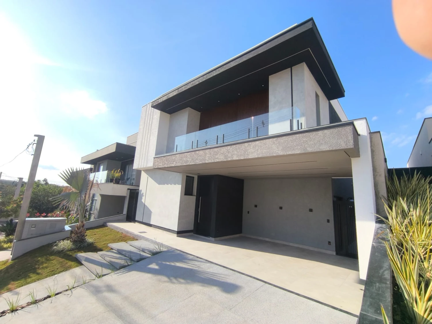 A fachada imponente conta com textura projetada, cimento queimado, fitas de LED, brise em alumínio amadeirado, porta de entrada em alumínio preto lambril com fechadura eletrônica e garagem coberta para 2 carros mais 2 vagas descobertas.