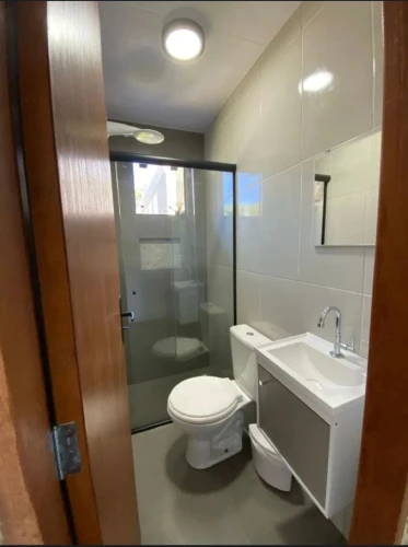 1 Banheiro Moderno: Funcional e equipado com móveis essenciais, pronto para uso.