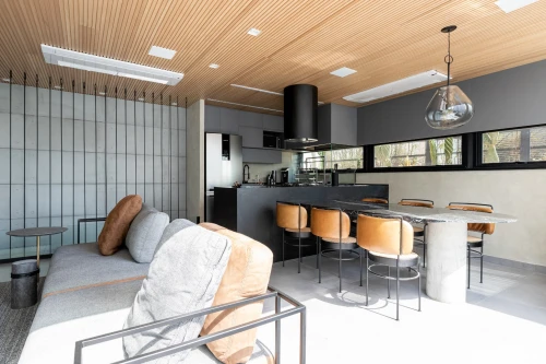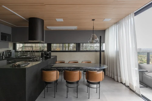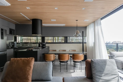 O layout contempla 2 suítes, sendo a master com amplo closet, além de 4 banheiros no total. A área social se destaca pela integração elegante dos ambientes e pelo uso de acabamentos nobres, como mármores Gris Armani e Nero Marquina, piso em madeira natural Tauari e forro em madeira ripada natural, criando uma atmosfera contemporânea e acolhedora.