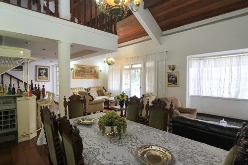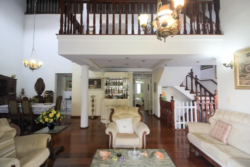 Primeiro piso com linda mansarda e exuberante pé direito todo amadeirado, com 03 maravilhosas Salas: de Estar, Jantar e de TV com uma agradável lareira. Barzinho com sanca de gesso e iluminação embutida, maravilhoso lavabo em mármore Carrara, Hall intimo para acesso a Suíte.