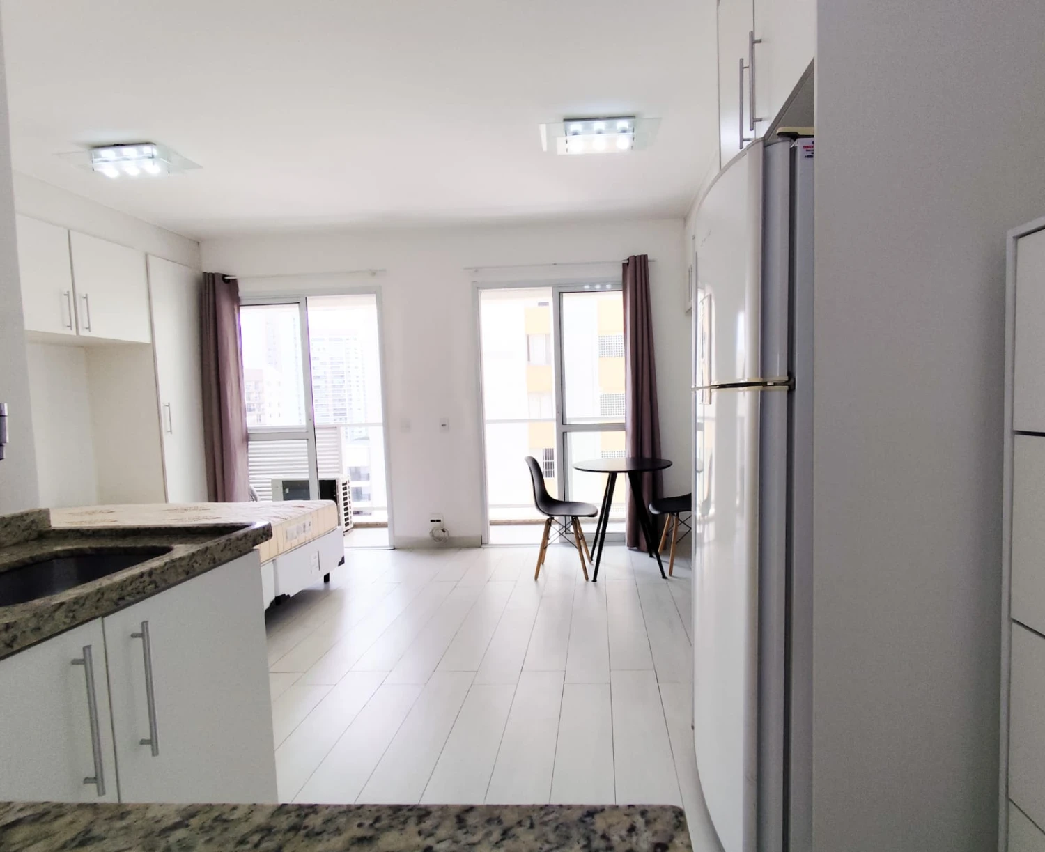 . mobiliado com TV, cama, geladeira, microondas, cafeteira, fogão elétrico , ferro de passar e mesa com 2 cadeiras.